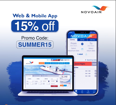 সম্মানিত যাত্রীরা SUMMER15 প্রোমো কোড ব্যবহার করে নভোএয়ারের ওয়েবসাইট ও মোবাইল অ্যাপ থেকে টিকেটের মূল্যে ১৫% ছাড়ের সুবিধা পাবেন।